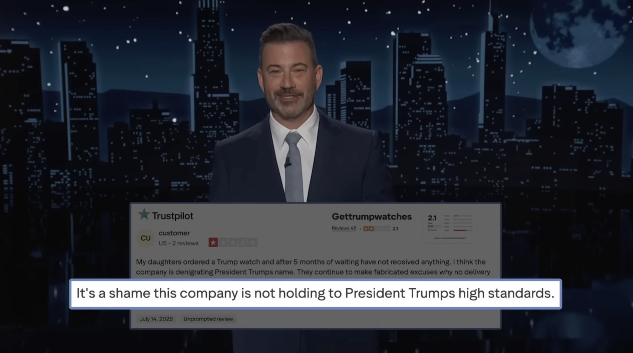 The late night show host goes on to pull up a review from a customer alleging they’d ordered a watch that still hadn’t arrived five months later, adding that it was a shame the company wasn’t “holding to President Trumps [sic] high standards.”