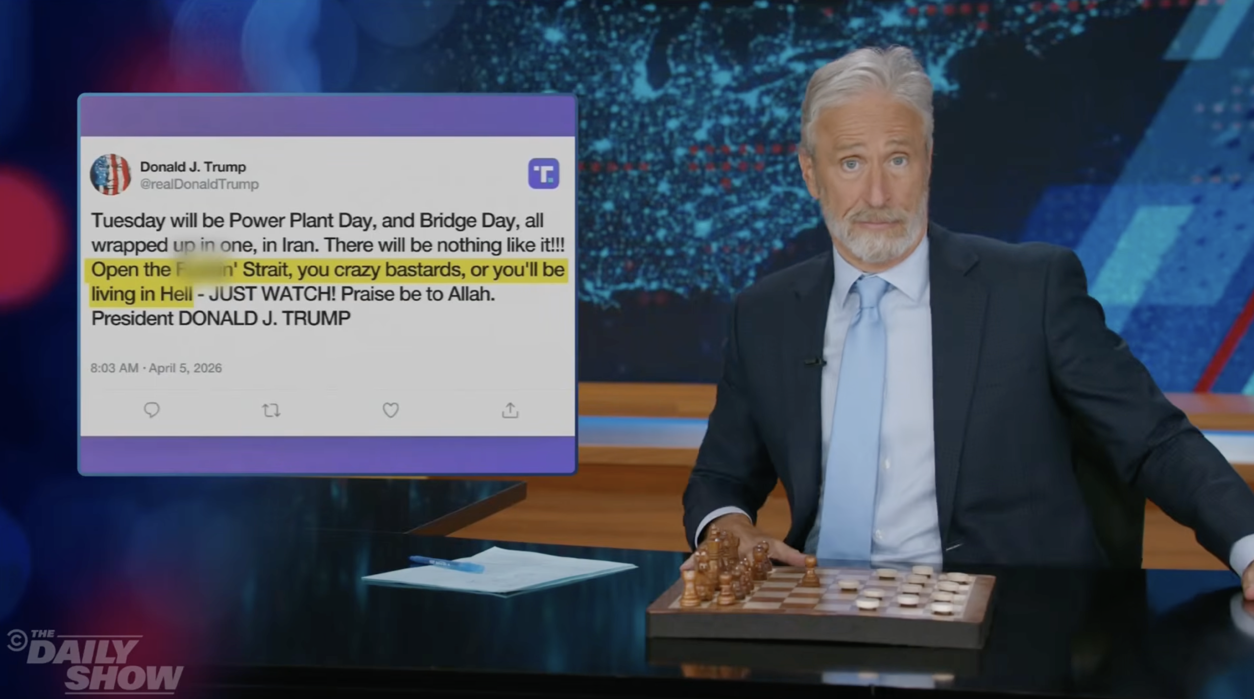 “So that’s where we’ve arrived at with The Art of the Deal,” Stewart summarises. “Basically it’s a cycle. It’s a cycle of demands and threats and premature declarations of victory that allows the negotiator enough wiggle room to at almost any point claim that they’ve achieved exactly what they set out to do — ultimately achieving a nuclear deal that’ll probably be worse than the nuclear deal Trump pulled our country out of with Iran, to start a devastating war that has killed thousands of innocent Iranians, 13 American soldiers, eroded our credibility as the leader of the free world, sabotaged the world economy, and will cost the American taxpayers, who knows, maybe trillions!”